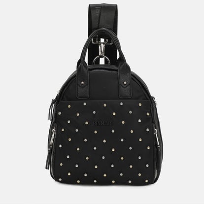Mochil de Binnari, confeccionada en nylon y PU. Con tachuelas plateadas, múltiples bolsillos y asas ajustables y extraíbles para llevar como mochila o bandolera. Detalles metálicos en nickel. Medidas: 33x28x11 cm