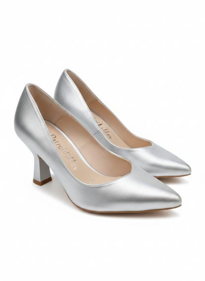 Zapato de salón modelo Alina en piel ante color Metal Plata. Tacón geométrico al tono y reforzado con una lágrima de gel debajo de la plantilla para hacerlo aún más cómodo. Con suela TPU que hace que sea flexible y antideslizante.