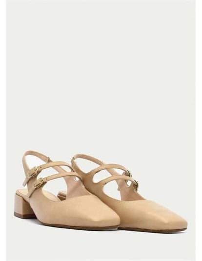 Zapato de salón destalonado de mujer en piel color Nude Detalle de dos tiras en el empeine ajustable mediante hebilla. Punta cuadrada. Un diseño confeccionado con tacón forrado al tono. Plantilla de piel y reforzado con una lágrima de gel para mayor comodidad.