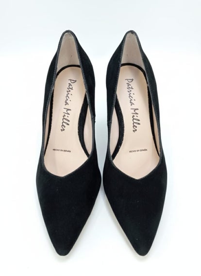 Zapato de salón modelo Alina en piel ante color Negro. Tacón geométrico al tono y reforzado con una lágrima de gel debajo de la plantilla para hacerlo aún más cómodo. Con suela TPU que hace que sea flexible y antideslizante.