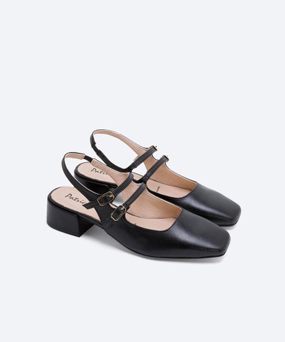 Zapato de salón destalonado de mujer en piel color NEGRO. Detalle de dos tiras en el empeine ajustable mediante hebilla. Punta cuadrada. Un diseño confeccionado con tacón forrado al tono. Plantilla de piel y reforzado con una lágrima de gel para mayor comodidad.