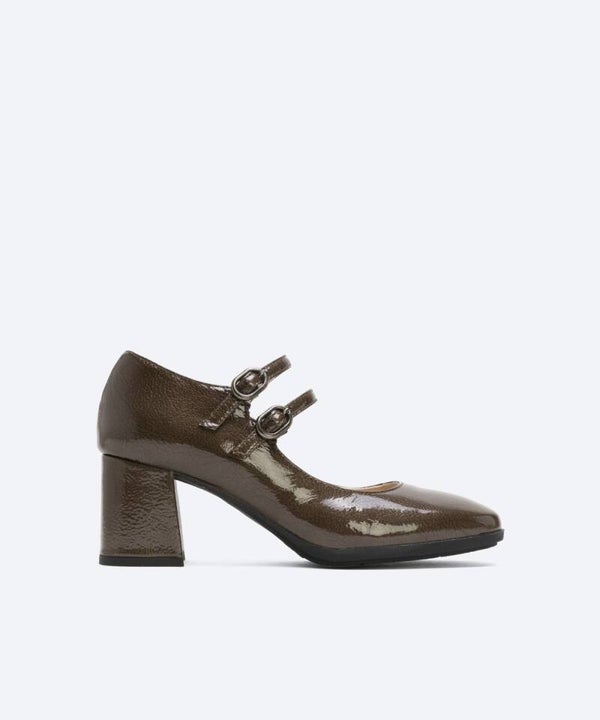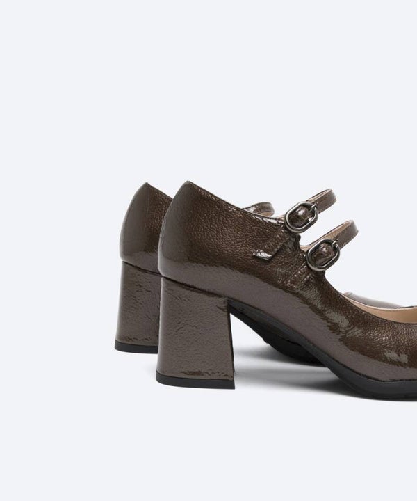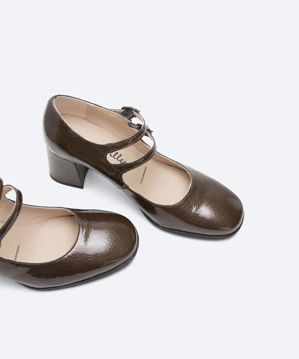 Zapato de mujer en piel charol color negro. Punta cuadrada y escote cuadrado. Con dos tiras en el empeine ajustable mediante hebillas metálicas. Un diseño confeccionado con tacón forrado al tono de 6 cm de altura y plataforma de 1 cm. Plantilla de piel y reforzado con una lágrima de gel para mayor comodidad. Suela TPU antideslizante. Un modelo muy elegante y de moda esta temporada.
