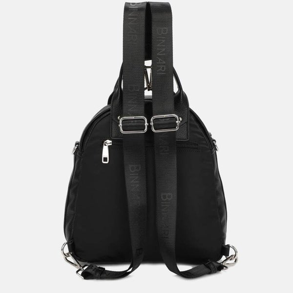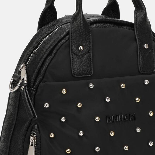 Mochil de Binnari, confeccionada en nylon y PU. Con tachuelas plateadas, múltiples bolsillos y asas ajustables y extraíbles para llevar como mochila o bandolera. Detalles metálicos en nickel. Medidas: 33x28x11 cm