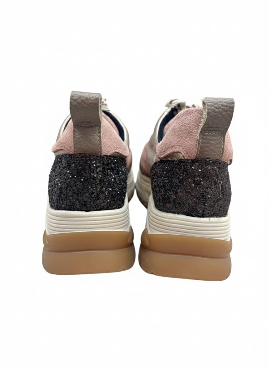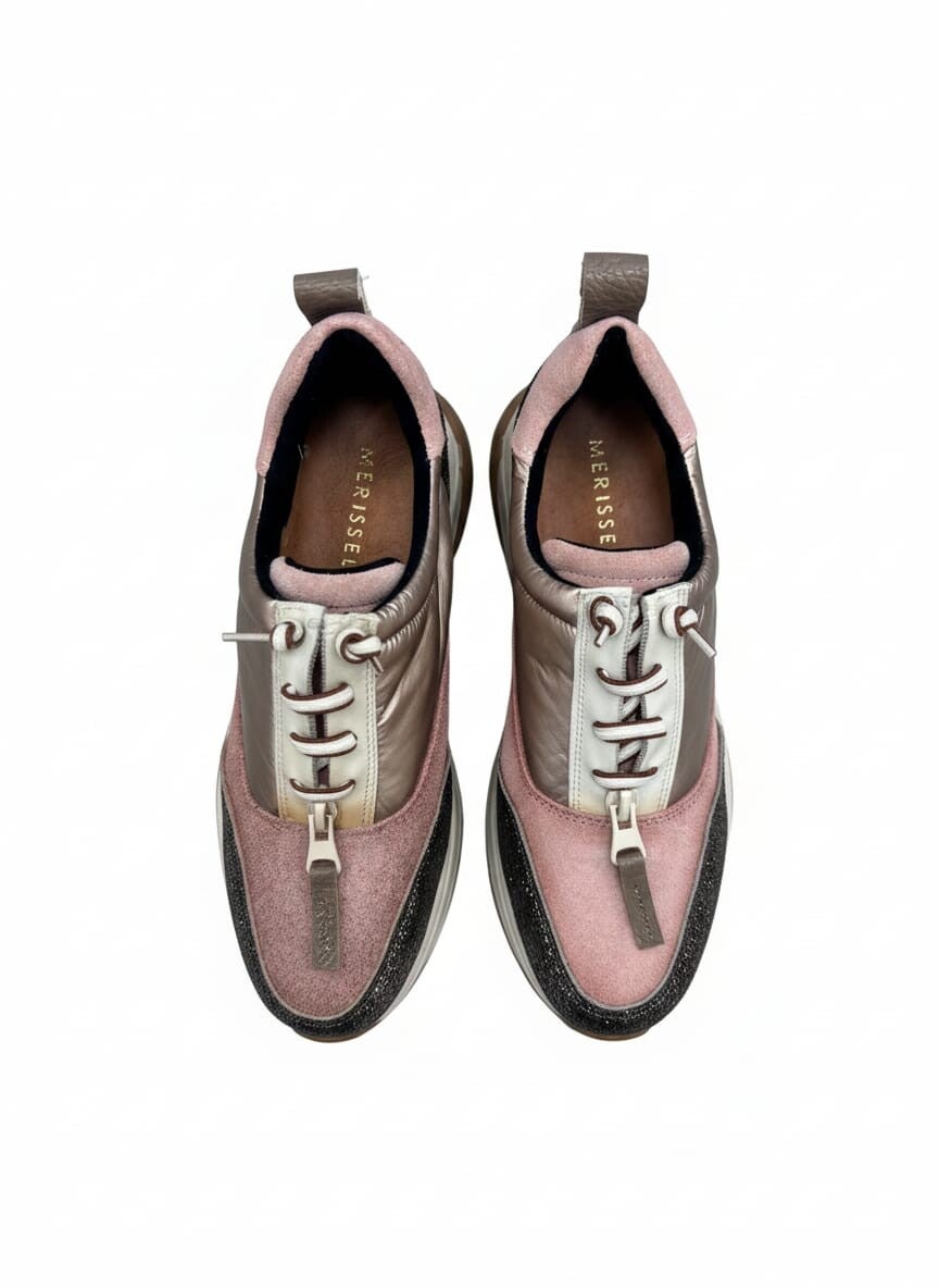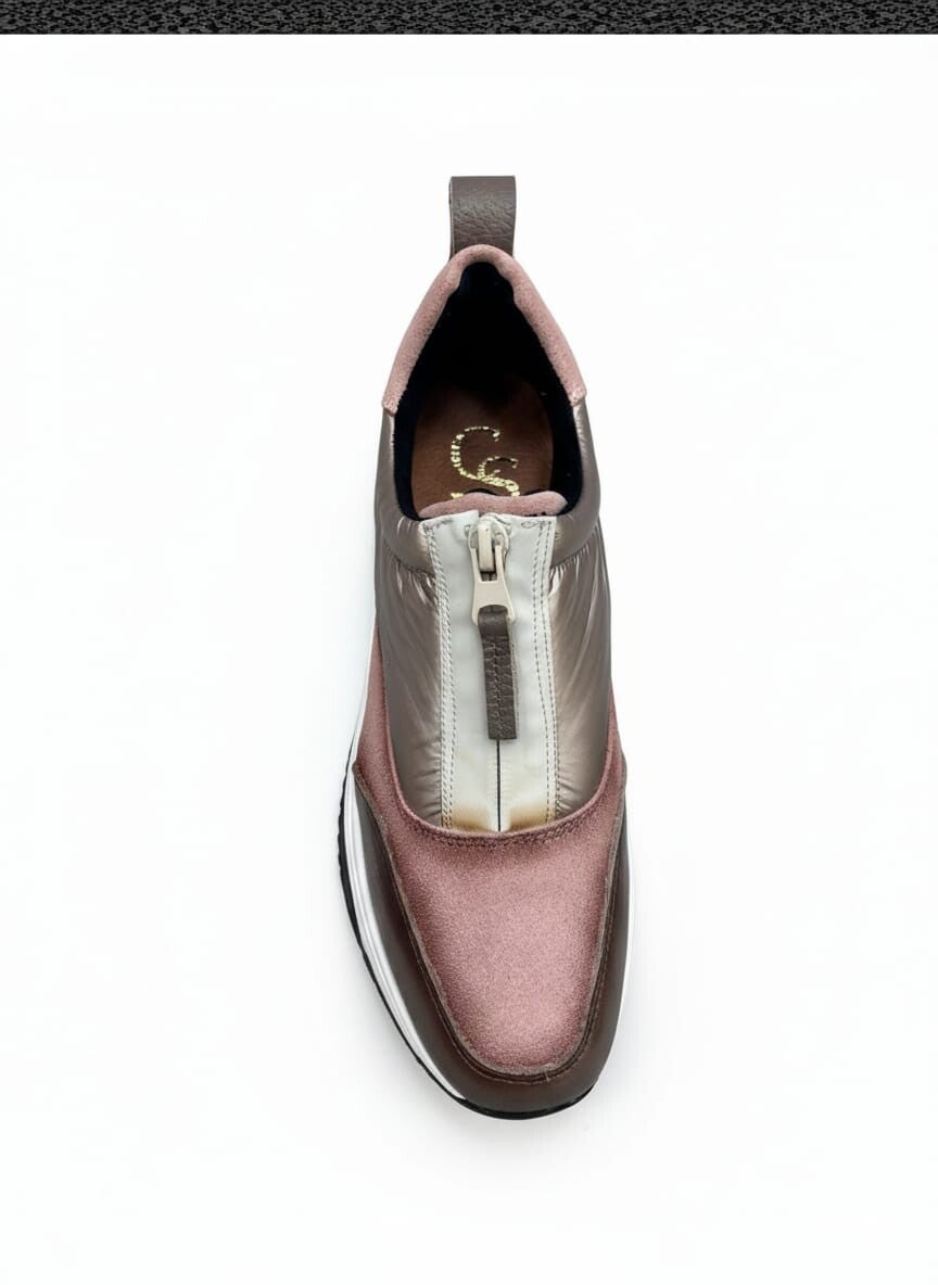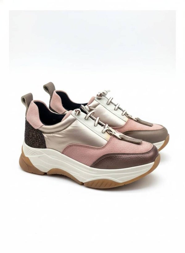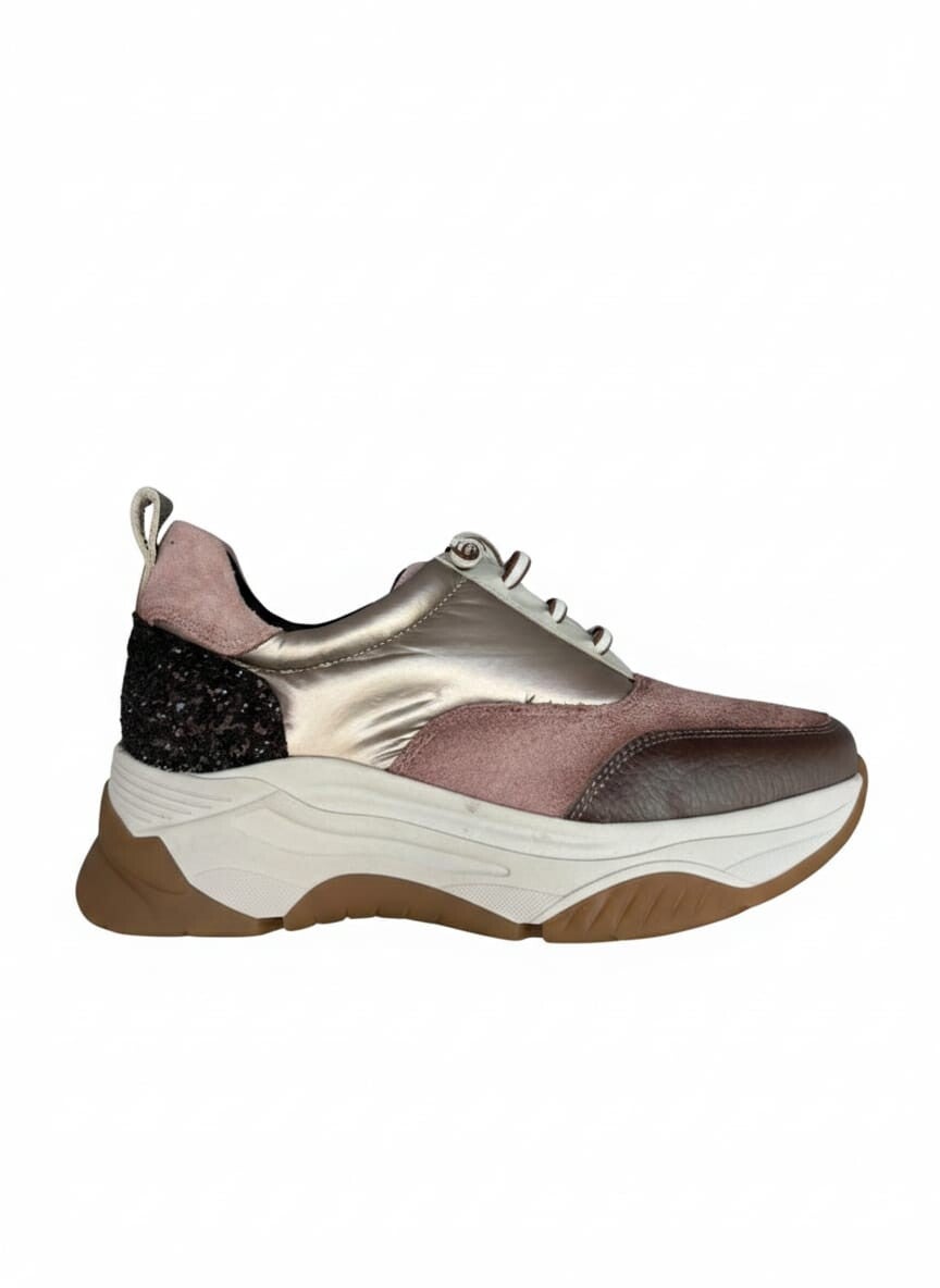 Deportiva con suela volumen elaborado en piel grabada dorado, piel rosa, piel marrón. El estilo Sport más versátil para tu día a día, Cierre con cremallera en el empeine