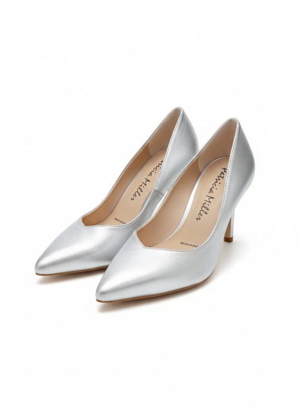 Zapato de salón modelo Alina en piel ante color Metal Plata. Tacón geométrico al tono y reforzado con una lágrima de gel debajo de la plantilla para hacerlo aún más cómodo. Con suela TPU que hace que sea flexible y antideslizante.