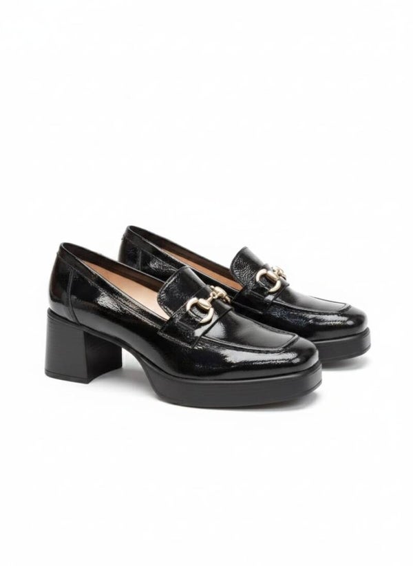 Mocasín de mujer Patricia Miller modelo 6411 en color Charol Negro. Este elegante zapato de calle, con un diseño clásico y tacón, es perfecto para añadir un toque sofisticado a cualquier atuendo. Confeccionado para ofrecer máxima comodidad y estilo, ideal para el uso diario o para ocasiones especiales, combinando tradición y modernidad en cada paso.