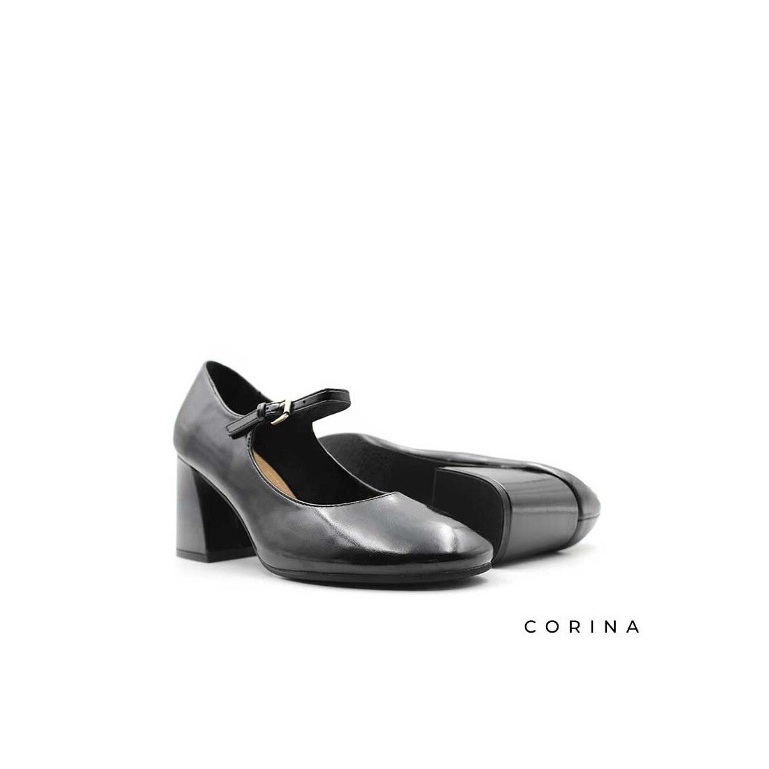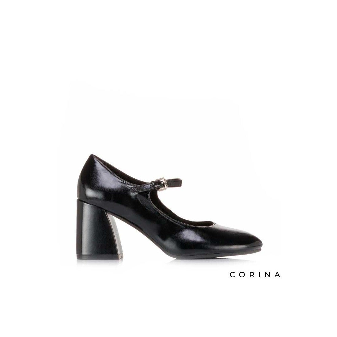 Estos Zapatos Negros con Tacon Ancho de Corina recuperan la esencia del icónico estilo y la reinterpretan con un enfoque actual: líneas limpias, brillo sutil y una pulsera fina que abraza el empeine con delicadeza.