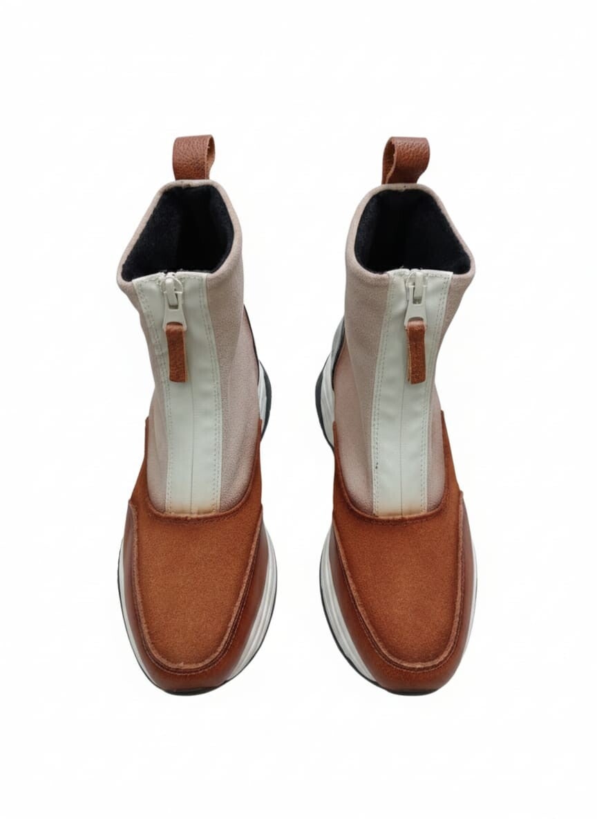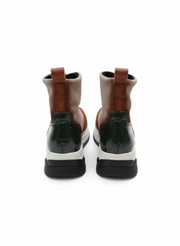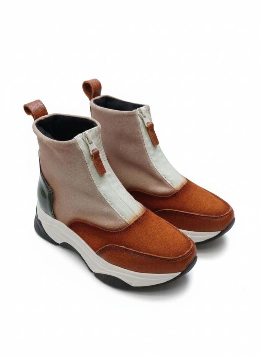 Botín plataforma, combinado, con cremallera en la parte delantera para su mejor calce. Un calzado de piel